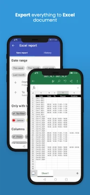 Työtietojesi hallinta ei ole koskaan ollut helpompaa. Vie mukautettuja ajanjaksoja kätevästi Excel-tiedostoiksi syvällisempää analysointia varten tai jaa ne vaivattomasti sähköpostitse, Dropboxin tai Google Driven kautta. Automaattinen pilvivarmuuskopiointi takaa, että tietosi ovat aina turvassa ja käytettävissäsi milloin tahansa. Pienyritykset voivat hyödyntää ryhmäseurantaominaisuutta tehostaakseen tiimin työajan hallintaa. Ja jotta pysyt ajan tasalla ilman erillistä avaamista, kätevä kalenteri-widget antaa sinulle nopean pääsyn tärkeisiin tietoihin suoraan laitteesi aloitusnäytöltä.