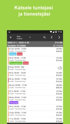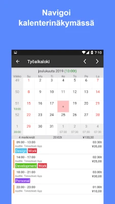 Timesheet: Kellokortti Työajat on helppo työkalu työajan ja ansioiden seurantaan. Se sopii freelancereille, yrittäjille ja tuntityöntekijöille. Tallenna työajat ajastimella tai kalenterilla, seuraa useita töitä, laske ylityöt ja palkat automaattisesti. Yksinkertaista laskutus ja työajan hallinta vaivattomasti.